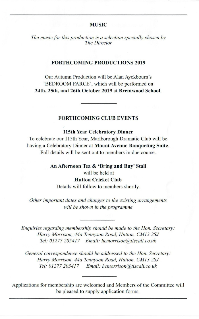 was performed by the Marlborough Dramatic Club in April 2019.