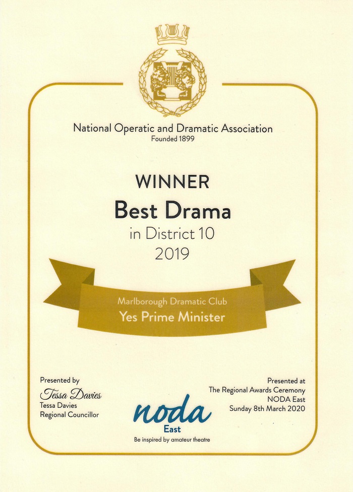 The Club's production of 'Yes, Prime Minister', performed at the Memorial Hall, Brentwood School in Spring 2019, was nominated alongside ‘Drinking Habits’ from the Blackmore Players and ‘Baggage’ from the Theatre at Baddow. The Gala Awards ceremony was held on 8 March 2020 in Stevenage and attended by a few members of the club.
